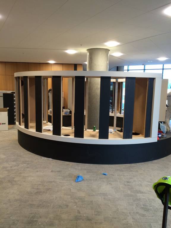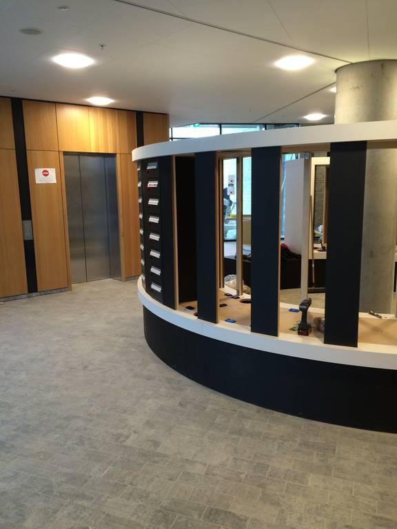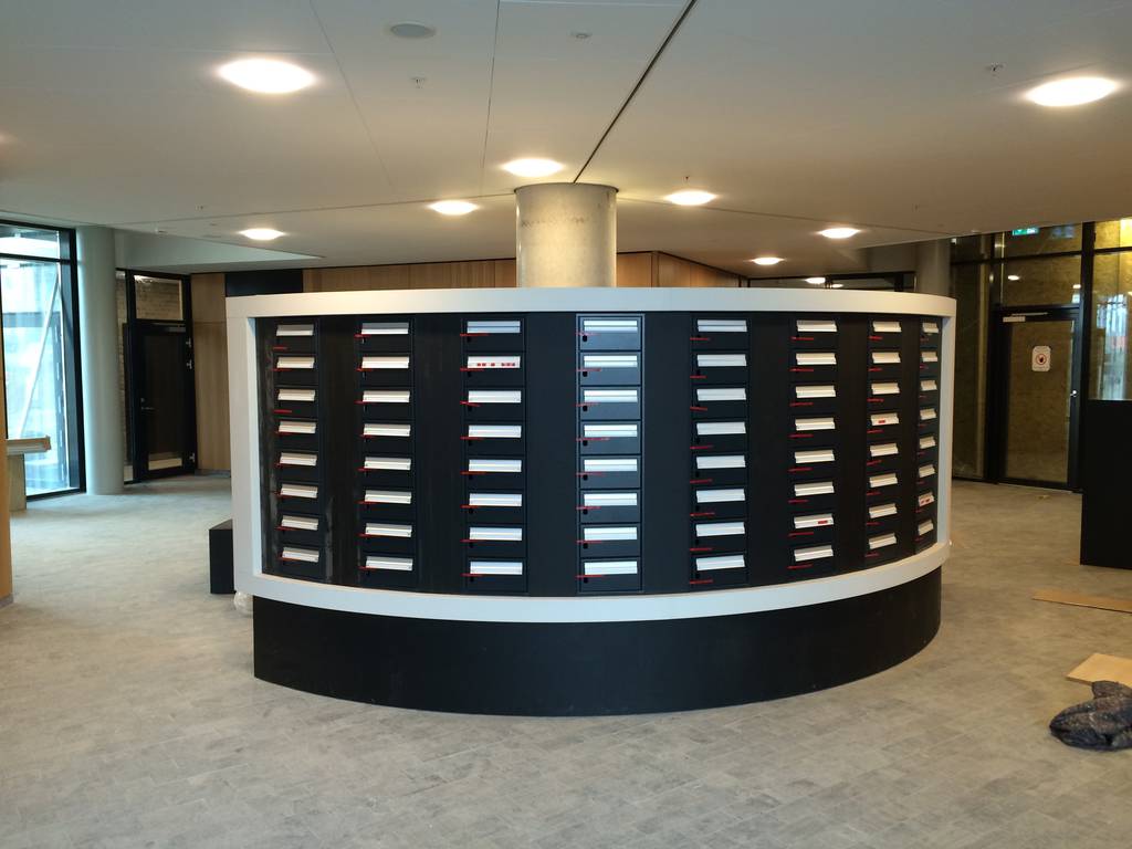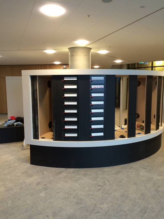 Postreol med siddegruppe i den ene ende er fremstillet på værksted i MDF belagt med linoleum. Rammen er udskåret i MDF og selve postkasserne er monteret i rammen.